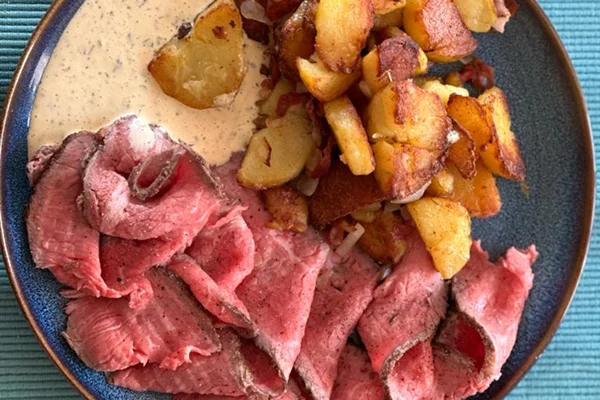 - Holsteiner Sauerfleisch mit Bratkartoffeln und hausgemachter Remoulade 17,50 €