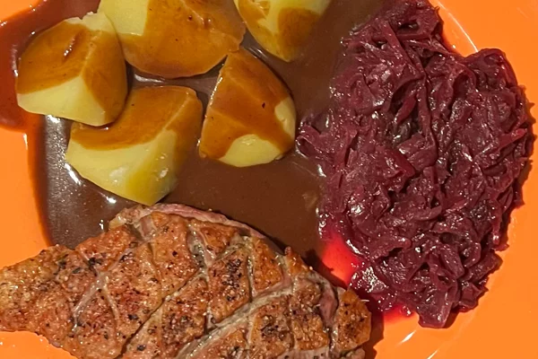 - „Omas“ Rouladen gefüllt mit Speck, Gurke und Zwiebel mit Rotkohl und Kartoffeln 21,50 €