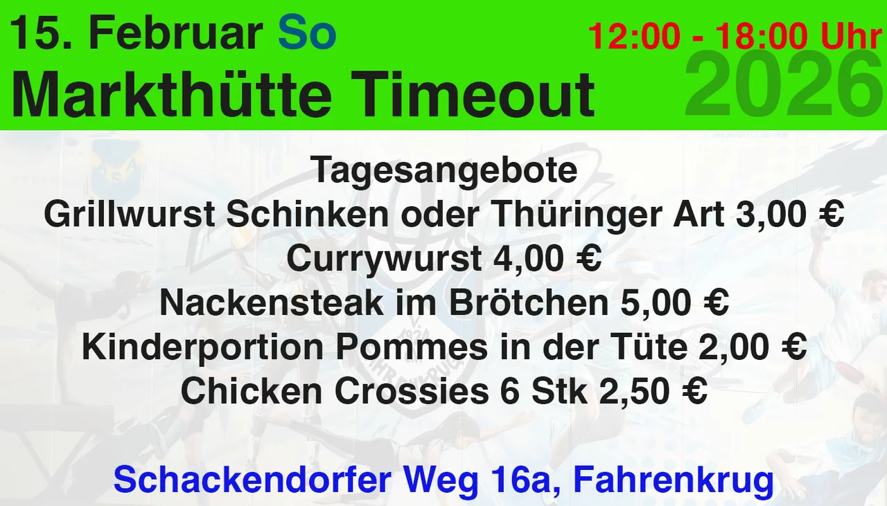 Das Timeout ist mit einer Markthütte vor der Halle am Start, bis der Umbau der Gastro abgeschlossen ist. Es ist immer Samstags und Sonntags ab 12:00-18:00 geöffnet. An Spieltagen enden die Öffnungszeiten nach 18:00 mit dem Ende des letzten Spiels.