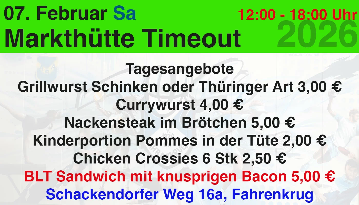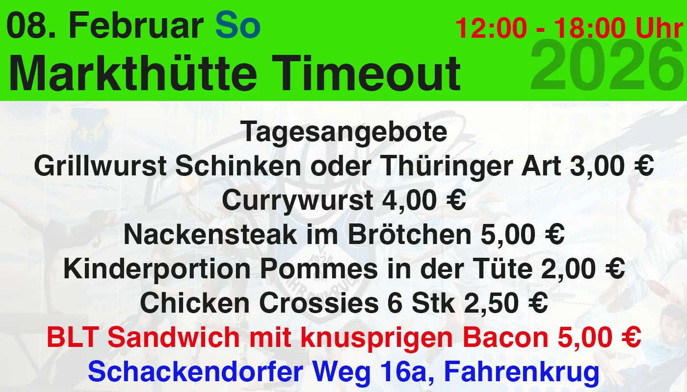 Am 07.02.206 ist Turniertag bis in den Abend. In der Halle servieren wir Kaffee, Kuchen, Laugenbrezel und andere Kleinigkeiten. In der Grillhütte bekommt ihr eine grosse Auswahl an leckeren Imbissgerichten. Probiert unbedingt unsere leckeren BLT Sandwiches, die wir frisch vor Ort zubereiten. Das Sandwich ist ein amerikanischer Klassiker mit knusprigen Bacon, Salat und Tomate, wahlweise auch mit Parmesan für nur 5 €!
